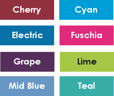 ELECTRIC, MID BLUE, TEAL, CHERRY, GRAPE, CYAN, FUSCHIA, LIME