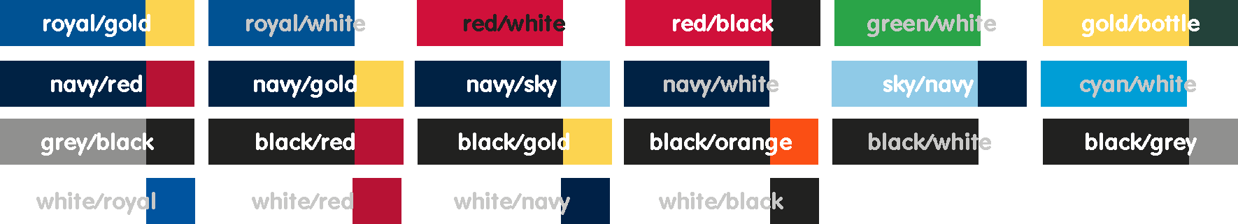 | COLOUR | BLACK/GOLD, BLACK/GREY, BLACK/ORANGE, BLACK/RED, BLACK/WHITE, CYAN/WHITE, GOLD/BOTTLE, GREEN/WHITE, GREY/BLACK, NAVY/GOLD, NAVY/RED, NAVY/SKY, NAVY/WHITE, RED/BLACK, RED/WHITE, ROYAL/GOLD, ROYAL/WHITE, SKY/NAVY, WHITE/BLACK, WHITE/NAVY, WHITE/RED, WHITE/ROYAL |