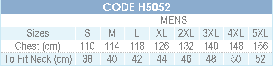 | SIZE | S – CHEST 110CM, TO FIT NECK 38CM, M – CHEST 114CM, TO FIT NECK 40CM, L – CHEST 118CM, TO FIT NECK 42CM, XL – CHEST 126CM, TO FIT NECK 44CM, 2XL – CHEST 132CM, TO FIT NECK 46CM, 3XL – CHEST 140CM, TO FIT NECK 48CM, 4XL – CHEST 148CM, TO FIT NECK 50CM, 5XL – CHEST 156CM, TO FIT NECK 52CM |