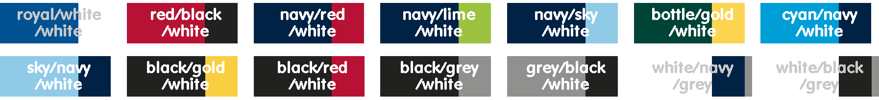 | COLOUR | ROYAL/WHITE/WHITE, RED/BLACK/WHITE, NAVY/RED/WHITE, NAVY/LIME/WHITE, NAVY/SKY/WHITE, BOTTLE/GOLD/WHITE, CYAN/NAVY/WHITE, SKY/NAVY/WHITE, BLACK/GOLD/WHITE, BLACK/RED/WHITE, BLACK/GREY/WHITE, GREY/BLACK/WHITE, WHITE/NAVY/GREY, WHITE/BLACK/GREY |