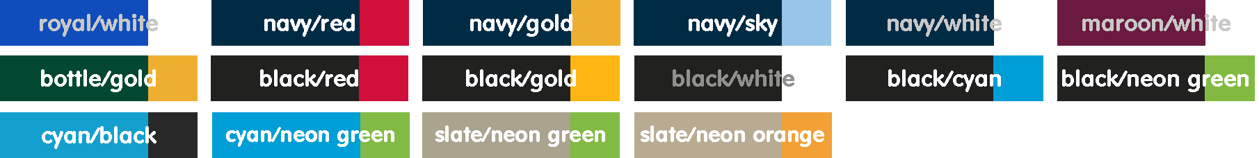 | COLOUR | BLACK/CYAN, BLACK/GOLD, BLACK/NEON GREEN, BLACK/RED, BLACK/WHITE, BOTTLE/GOLD, CYAN/BLACK, CYAN/NEON GREEN, MAROON/WHITE, NAVY/GOLD, NAVY/RED, NAVY/SKY, NAVY/WHITE, ROYAL/WHITE, SLATE/NEON GREEN, SLATE/NEON ORANGE |